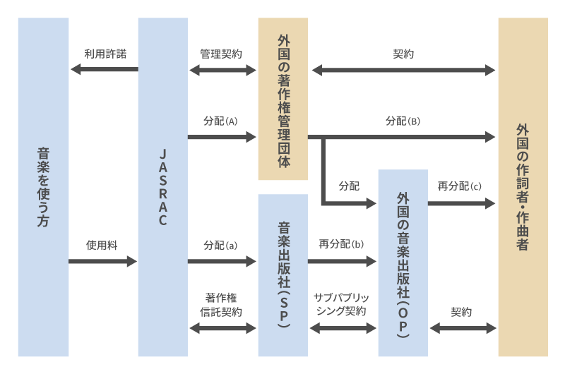 演奏権使用料など、著作権管理団体が作詞者・作曲者に直接分配する分については、JASRACからその作詞者・作曲者の所属する外国の著作権管理団体へ分配し、その団体から作詞者・作曲者へ分配されます(分配に関する国際ルール参照)。音楽出版社の取分については、JASRACからSPへ分配し、SPからOPに再分配されます。
