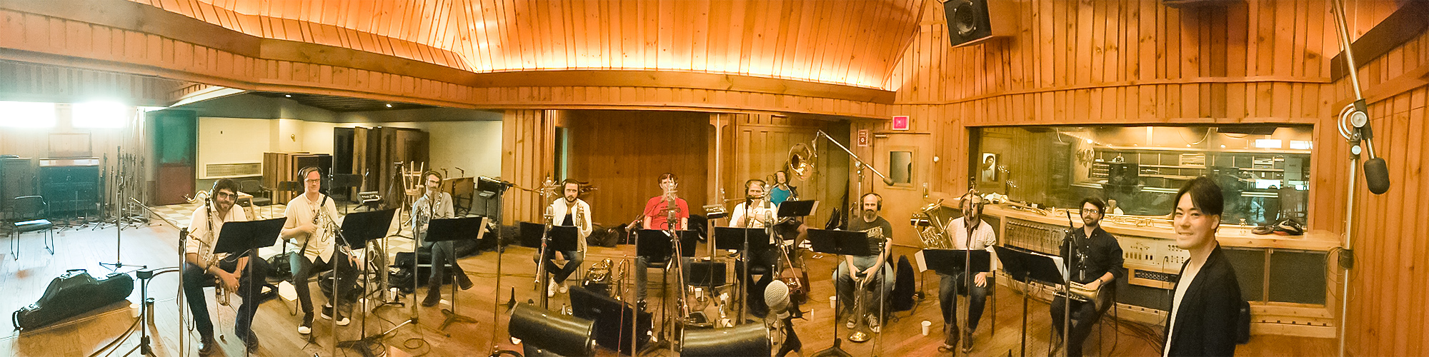 Avator Studio(現在・Power Station at Berklee NYC)でのブラスセクション録音風景。右端が横山さん