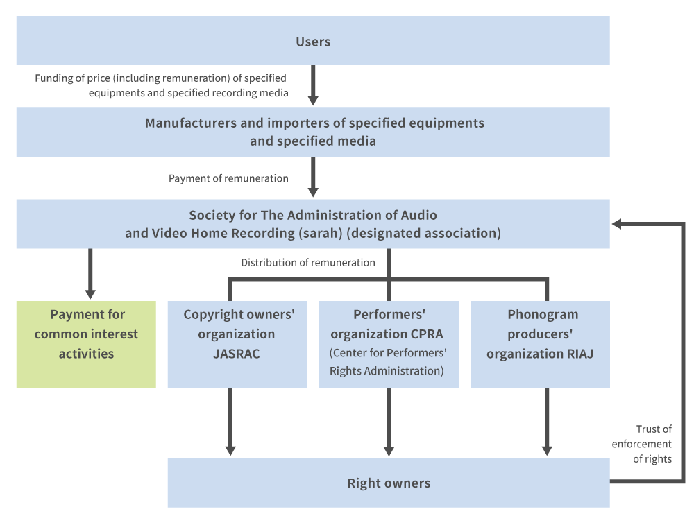 Society for The Administration of Audio and Video Home Recording (sarah), which is designated by the Commissioner of the Agency for Cultural Affairs, requests payment of and receives private audio recording remuneration. Remuneration is distributed from sarah to three organizations representing right owners, performers, and phonogram producers, and is then distributed to individual right owners (please see here for details on the distribution method(Japanese Only)).