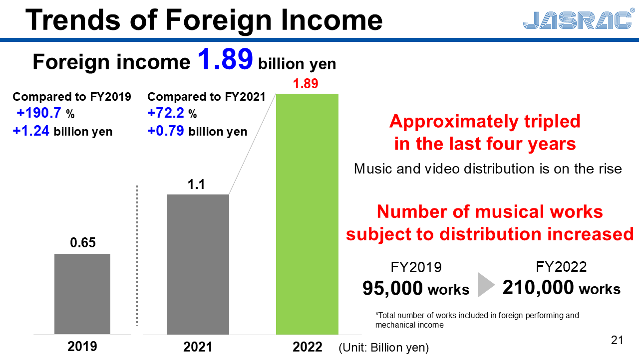 Digital music distribution service providers (DSPs) sign contracts with music copyright management organizations such as JASRAC in each country and region, and pay royalties for the use of musical works while also reporting on the use of those works. JASRAC manages musical works through agreements with copyright management organizations in each country and region. For example, when musical works administered by JASRAC are used overseas, the local management organizations receive royalty payments from DSPs and remit them to JASRAC, which then distributes the royalties to creators and rights holders in Japan (*1). The amount of royalties remitted from overseas to JASRAC in FY2022 was 1.89 billion yen, which is approximately three times the amount in FY2019, before the COVID-19 pandemic.