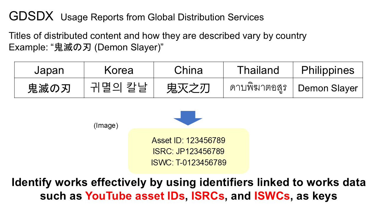 Each DSP reports the distribution work ID (see (1) above) that is globally used by each DSP to the copyright management organizations in each country and region, so it is possible to accurately identify the musical works used using this ID as a key. This makes it possible to accurately identify musical works even if the titles of works are converted to local notation in different regions through GDSDX. Furthermore, the ISWC (International Standard Musical Work Code) and work registration data (materials submitted by rights holders to copyright management societies) shared within CISAC will also be linked, which improves the efficiency of the work done by each organization up until the royalties distribution process.
