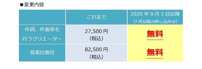 日本音楽著作権協会(JASRAC)は、9月1日契約(7月以降の申し込み)分から、作詞、作曲を行うクリエーターや音楽出版社等の権利者がJASRACと著作権の管理委託契約を締結する際にお支払いただく信託契約申込金(申込金)を無料にいたします。