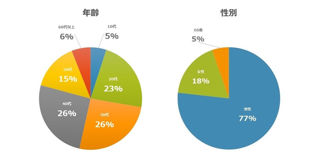 回答者の年齢は20~50代が中心でほぼ均衡に分布し、性別は77%が男性でした。