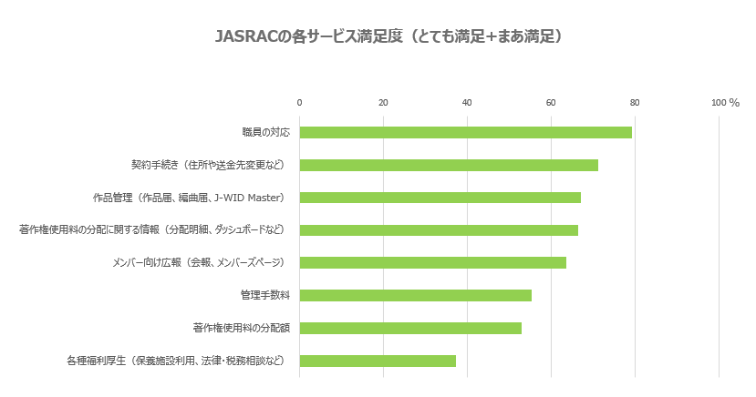 サービスごとに満足度をみると、「職員の対応」がもっとも高く、「契約手続き」、「作品管理」、「分配情報」、「メンバー向け広報」が続きます。「各種福利厚生」は、他のサービスと比べて低い結果となりました。