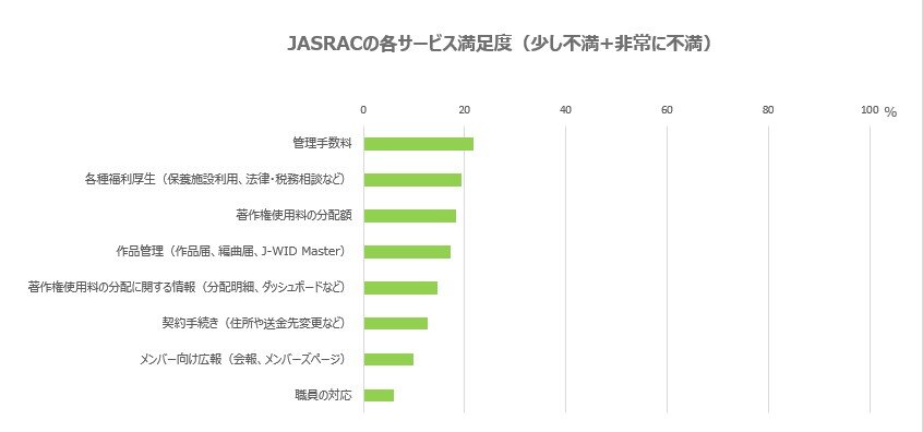 サービスの満足度の低い項目をみると、「管理手数料」、「各種福利厚生」、「著作権使用料の分配額」などが選択されました。