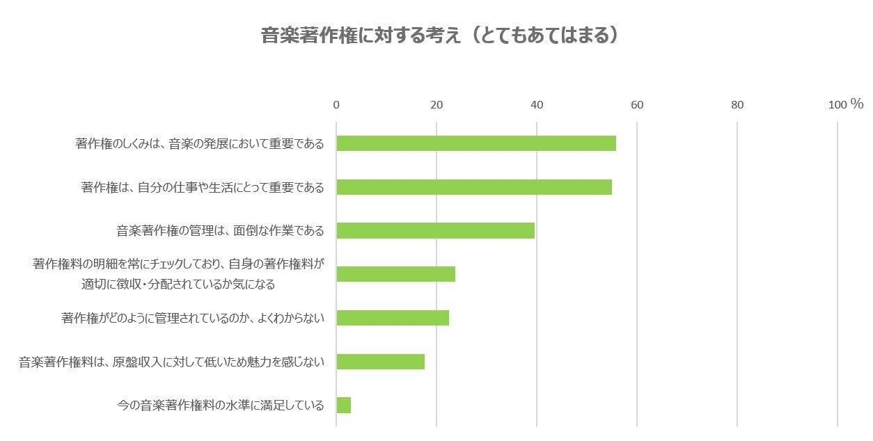 著作権に対する考え(「とてもあてはまる」、「まああてはまる」、「どちらともいえない」、「あまりあてはまらない」、「まったくはてはまらない」から回答)で「とてもあてはまる」と回答を得たのは「音楽の発展において重要である」が最も割合が高く、56%でした。これに「自分の仕事や生活にとって重要である」(55%)と「音楽著作権の管理は、面倒な作業である」(39%)が続きます。「音楽著作権料の水準に満足している」は、賛成率が非常に低い結果となりました。