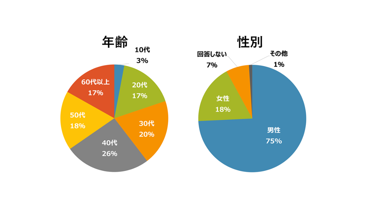 回答者の年齢は40代をボリュームゾーンとして万遍なく分布し、性別は75%が男性でした。