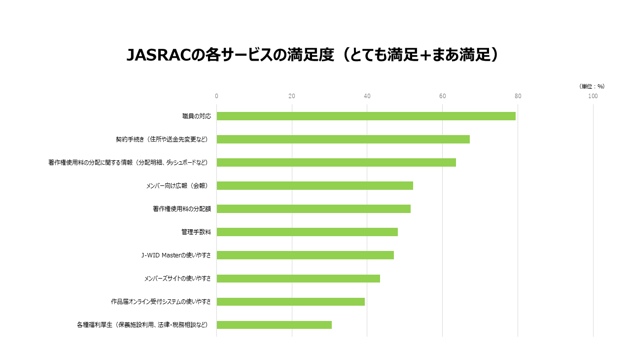 サービスごとに満足度をみると、「職員の対応」がもっとも高く、「契約手続き」、「分配情報」、「メンバー向け広報」、「使用料の分配額」が続きます。「各種福利厚生」は、他のサービスと比べて低い結果となりました。