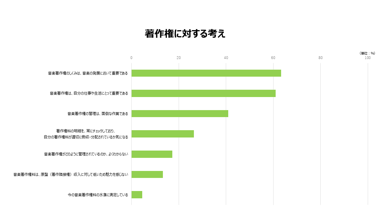 著作権に対する考え(「とてもあてはまる」、「まああてはまる」、「どちらともいえない」、「あまりあてはまらない」、「まったくあてはまらない」から回答)で「とてもあてはまる」と回答を得たのは「音楽の発展において重要である」が最も割合が高く、63%でした。これに「自分の仕事や生活にとって重要である」(61%)と「音楽著作権の管理は、面倒な作業である」(41%)が続きます。「音楽著作権料の水準に満足している」(4.5%)は、賛成率が非常に低い結果となりました。