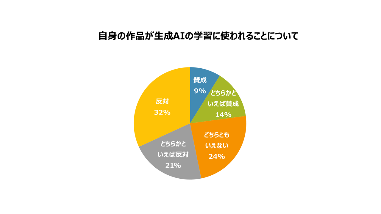 生成AIの開発事業者やサービス提供事業者が生成AIの開発や性能向上のためにあなたの作品を利用する(AIに学習させるデータとして利用する)ことについてどう思うか尋ねたところ、「賛成」「どちらかといえば賛成」との回答が23%、「反対」「どちらかといえば反対」との回答が53%となりました。