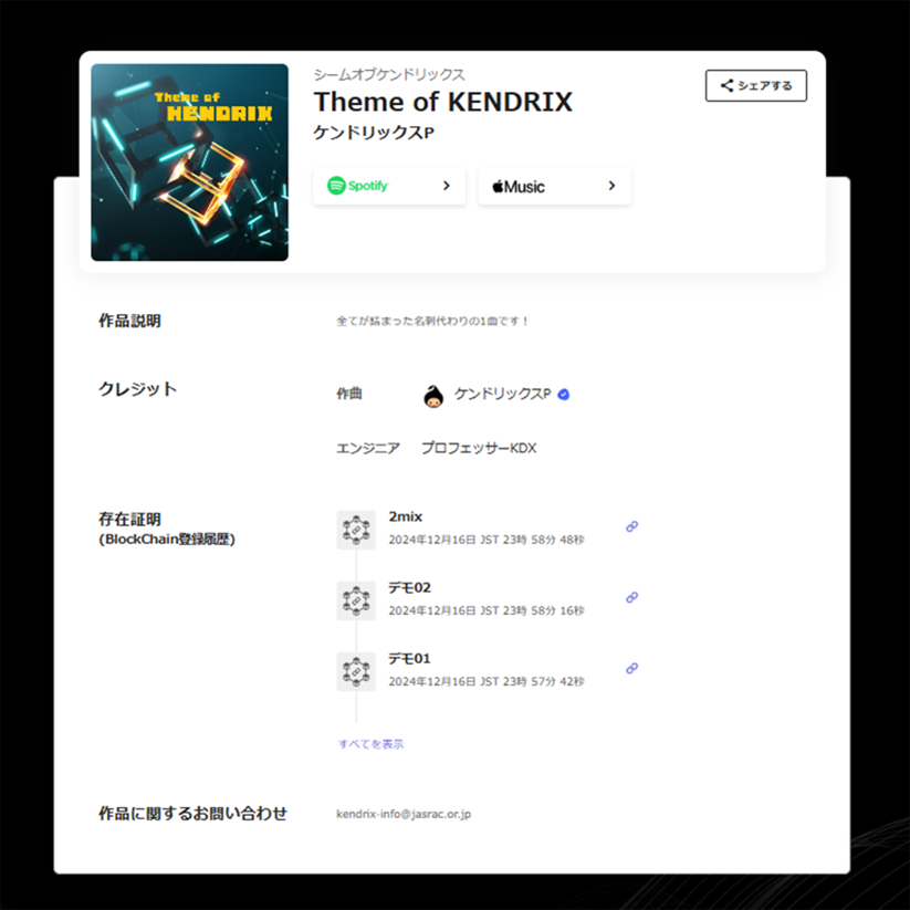 「楽曲お披露目ページ」は、音楽クリエイターがKENDRIXに登録した楽曲情報を基に、ジャケット画像、アーティスト名、配信サービスの情報へのURLリンク、演奏者などの情報を付加して、存在証明ページや著作者の情報とともにまとめて公開できるWEBページです。