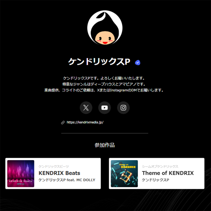 クリエイタープロフィール」は、音楽クリエイターがKENDRIXに登録した活動名義ごとに、プロフィール画像、プロフィール文、各種SNS等へのURLリンク、「楽曲お披露目ページ」などの情報をまとめて公開できるWEBページです。