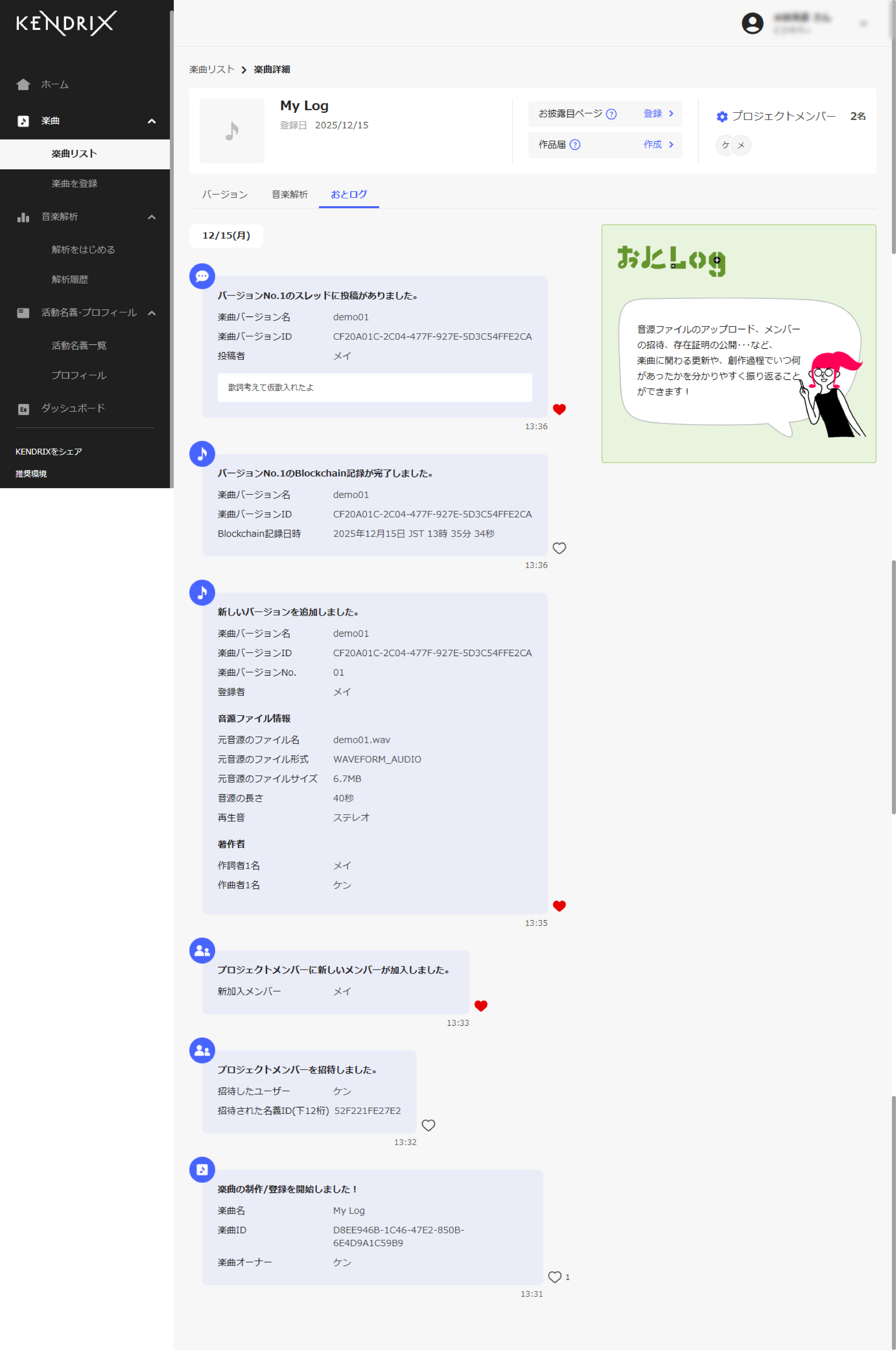 KENDRIX内で行われたさまざまなアクションを時系列で可視化する創作ログ機能「おとログ」を実装しました。