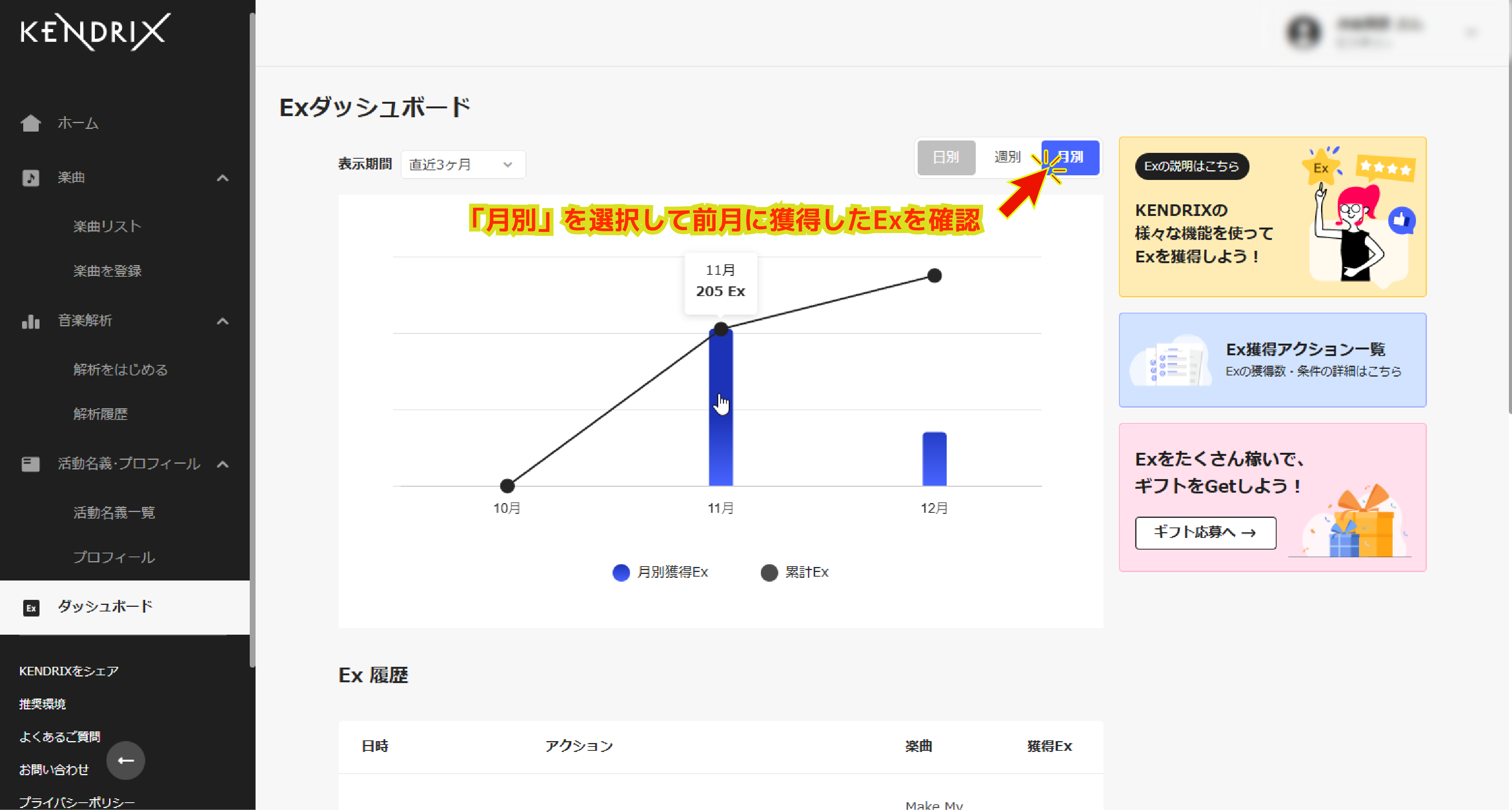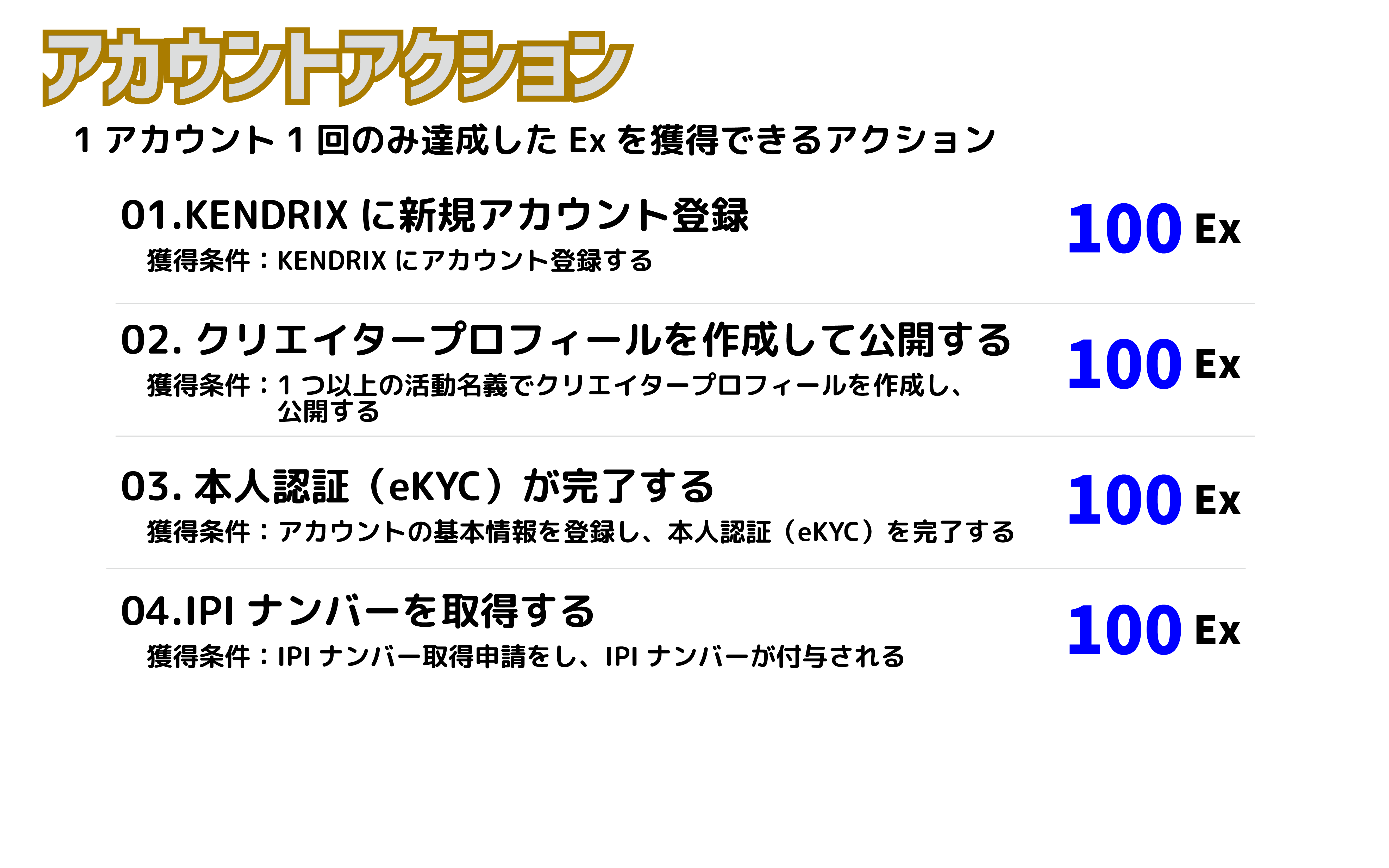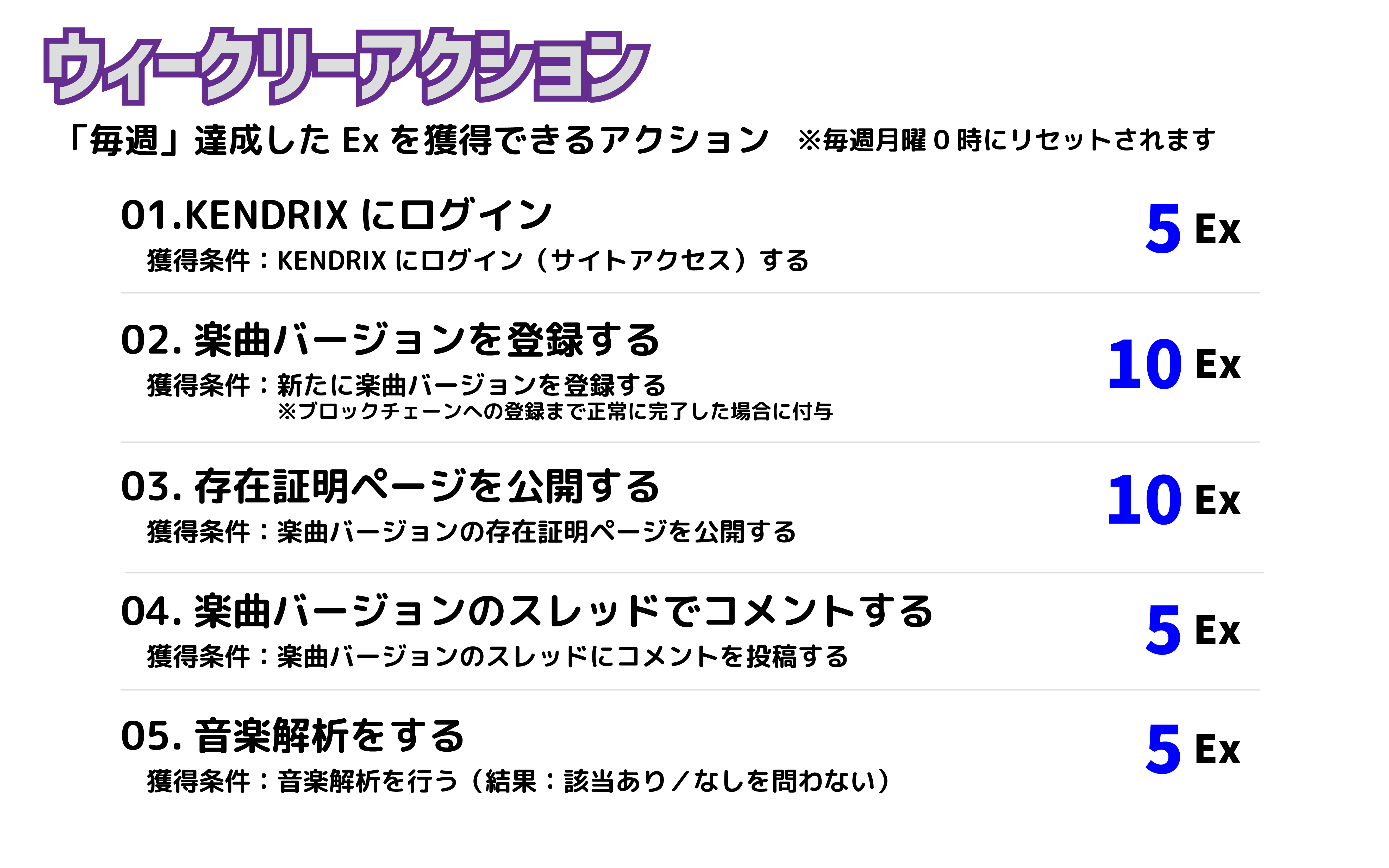 KENDRIXを活用することで、ポイント「Ex(イーエックス)」が貯まるようになりました。音源をアップロードする、音楽解析するなど対象のアクションを実行することでExが付与されます。Exが付与されるアクションは、「毎週」Exを獲得できるウィークリーアクション、「毎月」Exを獲得できるマンスリーアクション、1アカウントあたり1回のみExを獲得できるアカウントアクションの3種類があります。