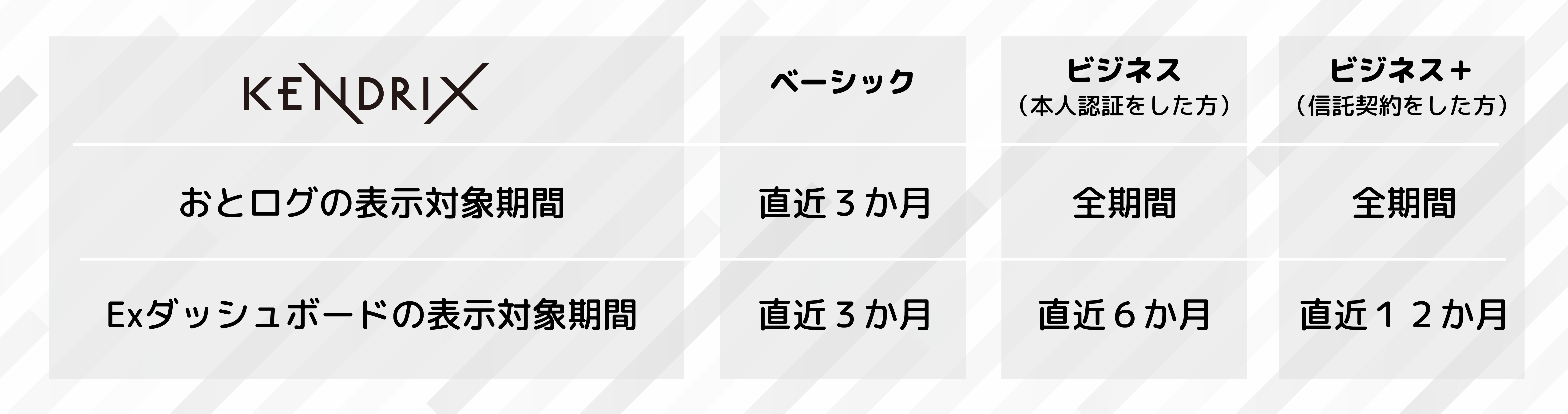 なお、おとログやExダッシュボードで情報や数値を参照できる期間は、KENDRIXのアカウント種別によって異なります。