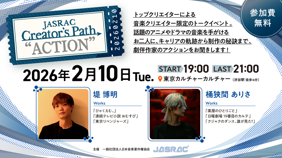 JASRACメンバーではない音楽クリエイター(作詞者・作曲者)に向けたトークイベント「JASRAC Creator's Path "ACTION"」を2月10日に渋谷区のイベントスペースで開催します。