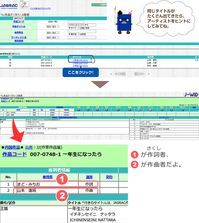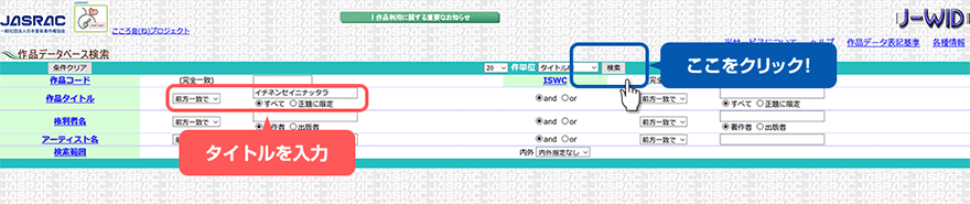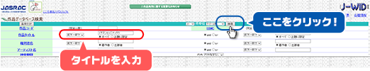 「作品タイトル」(赤いわくでかこった部分)に調べたい歌のタイトルを入れよう。入れたら、「検索けんさく」ボタン(青いわくでかこった部分)をクリックしよう。