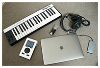 最近はスタジオを出て作業することが多いので、トランク一つに収まる持ち運び可能なコンパクトなシステムにこだわっています。パソコン、USBマイク、オーディオインターフェイス、MIDIキーボード、ヘッドフォン、これだけあればどこでも最高のパフォーマンスが発揮できます。