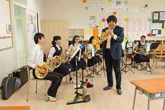 未来の音楽家や音楽ファンを育てていくために、プロのオーケストラなどで活躍する音楽家が先生になり、中学生や高校生に吹奏楽や合唱の指導をするイベントを行っています。生徒たちには、上手な楽器の扱い方や声の出し方などを教わりながら、仲間と一緒に一つの音楽を作り上げる「アンサンブル」を楽しく学んでもらいます。楽曲を作った人について考えてもらう機会として、著作権についても教えています。