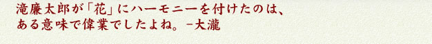 御詠歌は仏教の音楽ですけど、日本の音楽には西洋風なハーモニーはなかったですからね。滝廉太郎が「花」にハーモニーを付けたのはある意味で偉業でしたよね。近代音楽の幕開けというか。我々の世代以降は、ビートルズを「近代」と受けとめている人が多いんです。「全てはビートルズから始まった」というような。