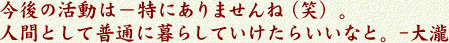 今後の活動は−特にありませんね(笑)。70年代から80年代にかけてはずいぶん頑張ったという自負がある。だから、私はもう既にいないものと思っていただきたい。各地の土壌でも研究しながら、人間として普通に暮らしていけたらいいなと。