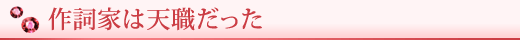 作詞はまったくの独学です。最初はとにかくいろんな人の真似をしながらたくさん書いて、友達に見せたりしていましたが、20歳を過ぎた頃から少しステップアップして、アマチュアバンドに歌詞を提供するようになりました。その間に就職して会社勤めもしていましたが、3ヵ月くらいで飽きちゃうんです。決められた時間、決められた場所に毎日きちんと通うのが苦痛で。それで12回も転職してしまいました。今、作詞家を続けられているのは、会う人、会う場所、会う時間が毎回違うから。緊張感が保たれて遅刻しない(笑)。だから天職ですね。