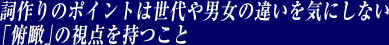 見ているものや感じ方は人それぞれ、年齢や性別などで微妙に違うのでしょうが、下手に子供や若い女性の視線に合わせようとすると失敗するケースが多いと思うんです。細かい部分は、発注サイドの意向やアーティストのカラーによって変わってきますが、大切なのは、年齢・性別の違いを超えた「俯瞰」の視点です。個人的には、技術的にコドモっぽい、オンナっぽい詞を書こうとしている人の作品よりも、銀色夏生さんのように中性的な感性を持った作家の作品に感動することが多いですね。