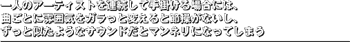 ワンパターンという意味では、ローリング・ストーンズは凄いと思いますよ。彼らも時代に合わせ新しいサウンドを取り入れてますが、ライブに来るお客さんは、70年代そのまんまの驚異的なワンパターンを望んでいるんじゃないでしょうか。僕自身もリスナーだったら、打ち込みでタイトなリズムじゃなくて、チャーリー・ワッツのもったりとしたドラムを聴きたいと思いますからね(笑)。 |
